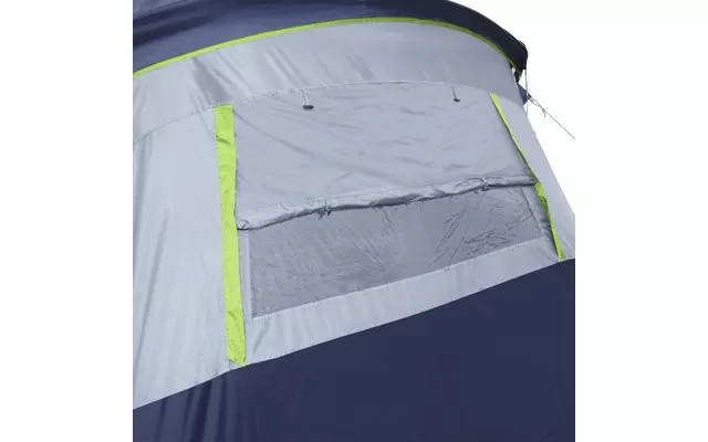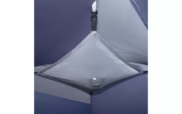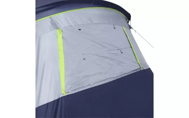 Six windows (50% mosquito screen, 50% foil) provide sufficient light and ventilation in the tent. Mosquito screen in the roof provides optimum air circulation. The tent can be set up without a roof. Double-concealed zip fasteners provide for a closed tent. There is a lamp attachment in the middle. The doors of the sleeping compartment can be completely covered and additionally have a mosquito door. Sleeping compartments are not removable.