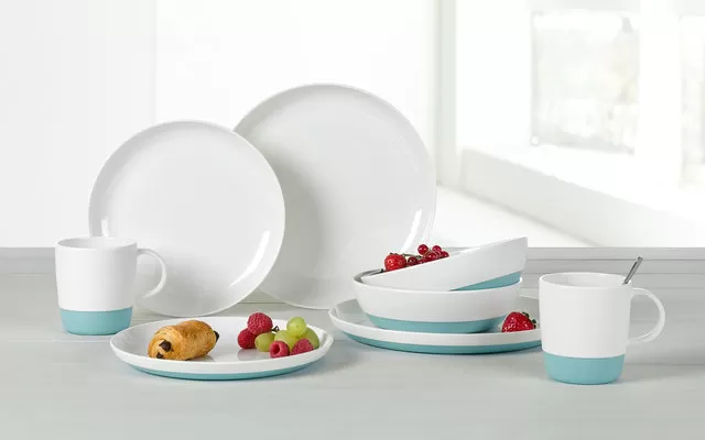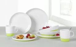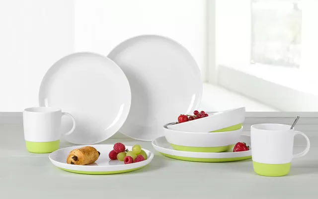 2 mugs (350 ml), 2 bowls (Ø 17.7 cm), 2 dessert plates (Ø 21.2 cm), 2 dinner plates (Ø 25 cm)