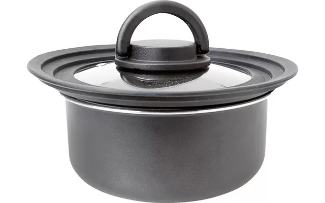 9-piece aluminium pot set with new VACUBLOCK technology and high-quality non-stick coating in modern Stone Rock design. Including practical universal glass lid with stepped silicone rim and steam hole for pressure equalisation – fits pots and pans with three different diameters. The second glass lid with silicone noise protection rim is perfected by integrated drip holes for easy pouring and a slot for easy attachment of the grip pliers. Both glass lids are equipped with space-saving folding handles