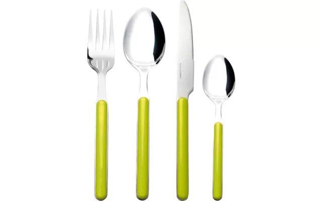 16-piece cutlery set with solid, stainless metal core and shapely plastic handles. The set is dishwasher safe.