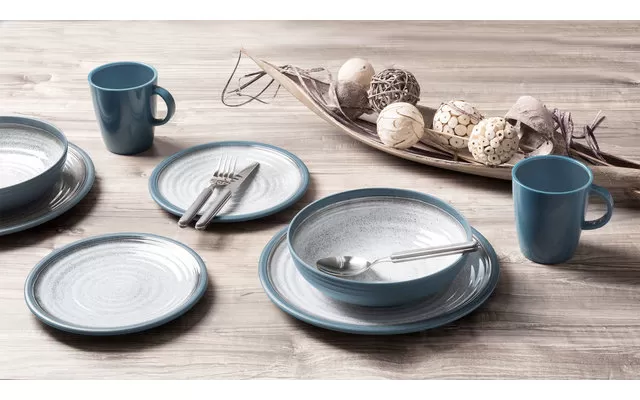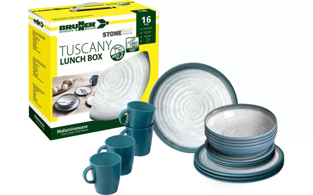 The Lunch Box Tuscany is a high-quality processed, 16-piece tableware set consisting of various plates with original stoneware look. All plates are made of StoneTouch material, a break-resistant melamine resin/mineral mixture with a great porcelain feel and excellent properties for camping and outdoor use. The Hotmug mugs included in the set, on the other hand, are made of a special heat-resistant material that can withstand temperatures of up to 100°C (boiling water) for short periods without any problems. In addition, all parts have a very practical anti-slip ring, especially for mobile use.