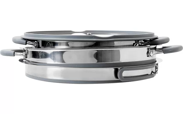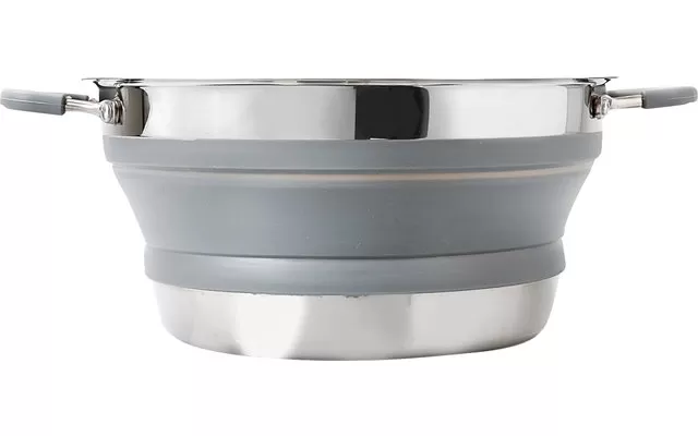 The 4-piece cooking set made of high quality stainless steel and silicone consists of a large pot, a pan with folding handle, a practical strainer and a lid made of shatterproof glass as well as an anti-slip edge. The handles are coated with heat-resistant silicone. And best of all: thanks to flexible silicone walls, the set can be folded extremely flat (9 cm high) and stowed inside each other – so it takes up very little space in your luggage. It is also easy to clean, food safe, BPA-free and dishwasher safe.