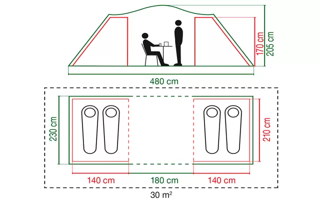 The tent sleeps a total of 4 people and features 2 large sleeping cabins and a generously light and spacious living area.