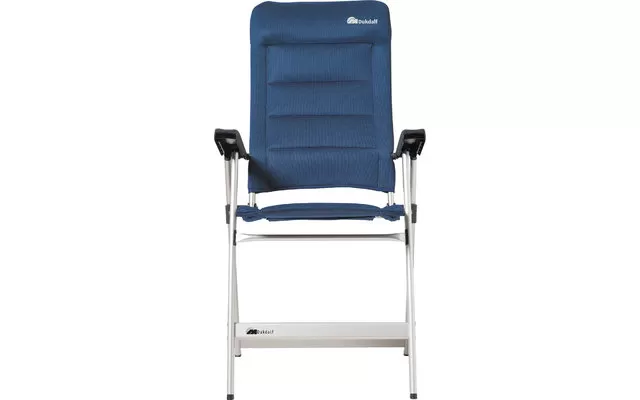 The comfortable upholstered camping chair has an ergonomically shaped backrest and an extra stable frame made of anodised double-reinforced aluminium poles. Therefore, the chair is a light one, carrying a weight of 140 kg. The armrests are extra wide and made of glass fibre reinforced nylon