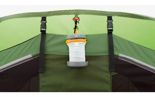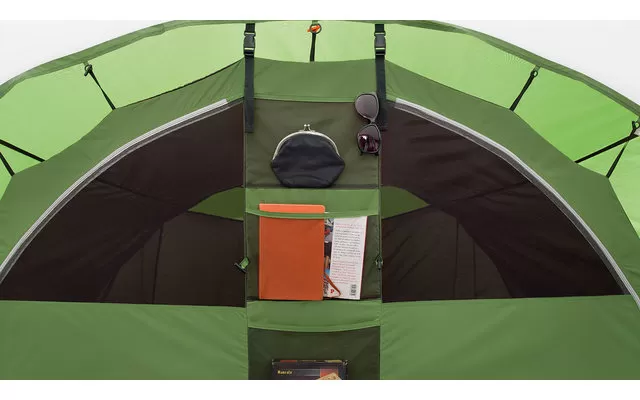 The Palmdale 500 sleeps five in two sleeping cabins and features a front and side door for flexible access. Color-coded fiberglass poles and pole channels make the tent quick and easy to set up. A sewn-in groundsheet prevents drafts, while curtained windows in the living area let in plenty of light. The deep canopy over the entrance door with insect screen and windows provides extra protection for access, cooking and bike parking.