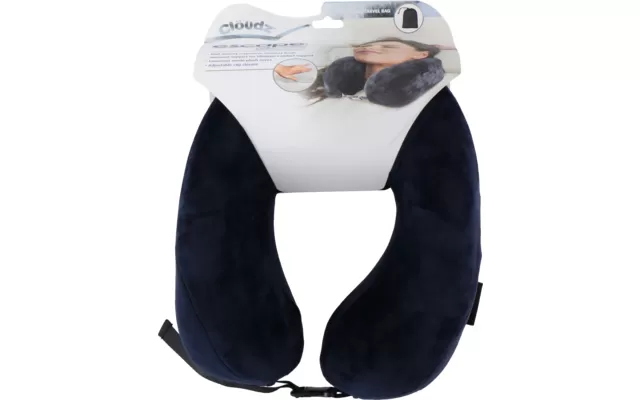 Memory foam neck pillow. Luxurious plush cover. With clip to close. Bag included for storage.