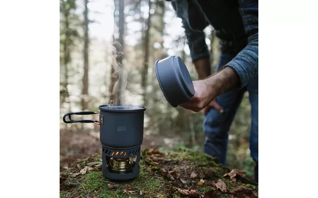 We have developed this set for those who want to satisfy more than just a small appetite with a small, compact spirit cooking set – but for whom weight and pack size still play an important role. The stand, the support for our dry fuel tablets and the spirit burner can be easily stowed in the large pot. So that the flame can be easily extinguished after cooking, this set is also equipped with our flame regulator with folding handle.