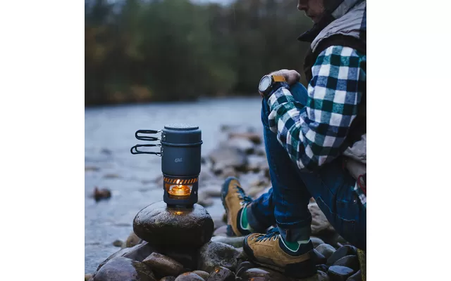 The small pot holds approximately 470 ml and also serves as a lid for its approximately 985 ml counterpart. Both pots have stainless steel folding handles. The stand can be transported in the larger pot to save space.