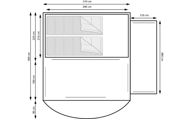 The tent has a large living area with fixed groundsheet and comes with a 2 person inner tent of 140x190cm.