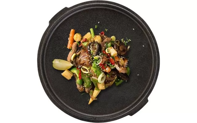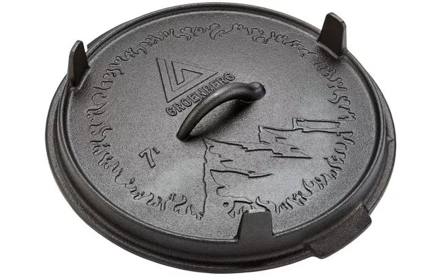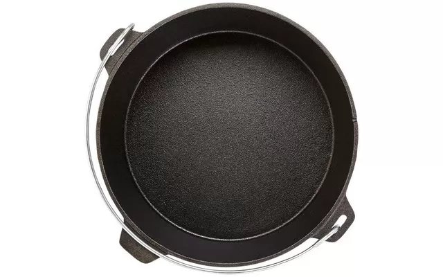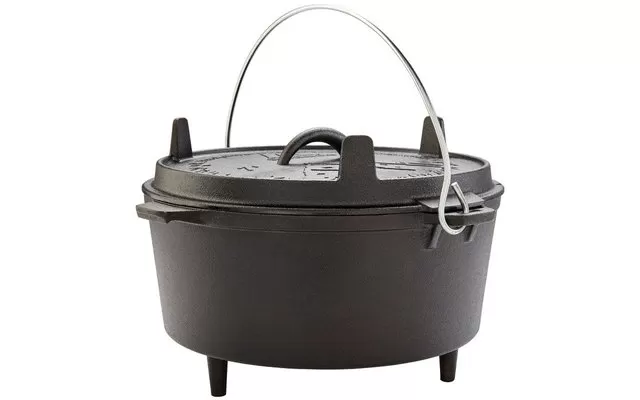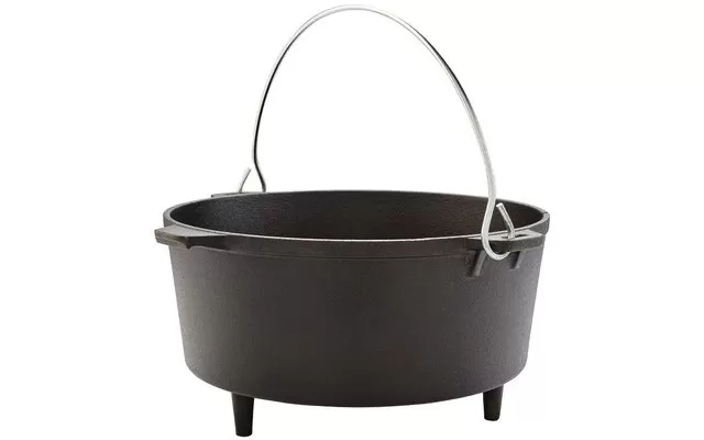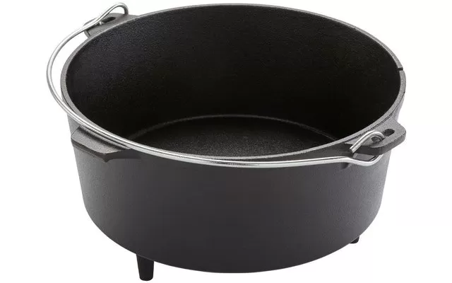 Cast iron pot with high thermal conductivity and constant all-round heat. Thus, stews, soups, vegetables, meat or bread gently become a pleasure. The lid is slightly concave so that condensation inside can drain off to the edge and nothing drips into the dish when the lid is lifted. A steam outlet on the lid prevents annoying rattling or overcooking. Particularly practical: the lid can also be used as a pan or serving dish and, thanks to its feet on the top, stands slightly elevated and absolutely safe. Suitable for grill, gas stove, oven or open fire.