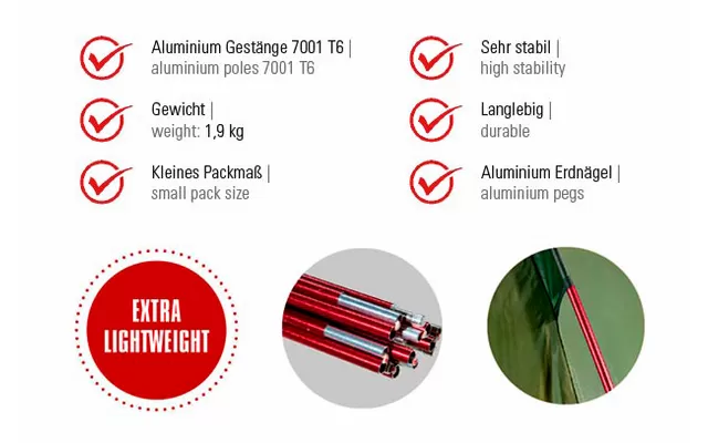 - Poles: Aluminium poles 7001 T6 7,9 mm