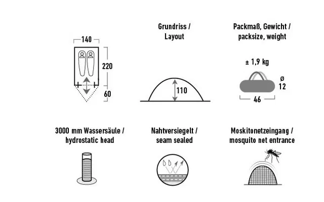The vestibule provides additional storage space and the large high ventilation provides optimal air circulation. The entrance with mosquito net brings additional fresh air into the tent and protects against insects. The tent is equipped with a practical mesh shelf and a lamp holder. The Kingfisher 2 lightweight offers enough space for 2 people with luggage and is ideally suited for bicycle, motorcycle, canoe tours and wilderness trekking camps.