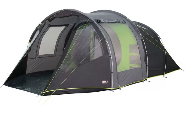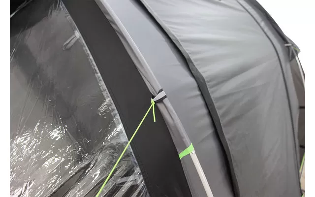 Family tunnel tent in standing height. The large porch with gauze side door and gauze window can be optimally ventilated and offers plenty of space for camping equipment and stay in bad weather. Clear film windows bring daylight into the apartment and the curtains protect from prying eyes. The easy-care tent floor, sewn to the inner tent, cannot shift. The decay strips keep dirt and moisture out. 3 Permanent ventilation systems ventilate the tent optimally in all weather conditions and must always be open. The tent has extra strong zippers and reflective guy straps for more safety. The very stable 5 mm diameter steel pegs do not bend even on hard ground. Special 5 mm steel ground pegs with hooks for better grip of the guy lines are supplied for guying. The zipper cover is equipped with an additional rain gutter.