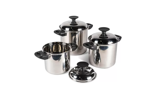 Lightweight yet sturdy – thanks to the high-quality stainless steel construction. The Space Saver cooking set with three pots can be stacked and thus stored space-saving.