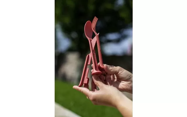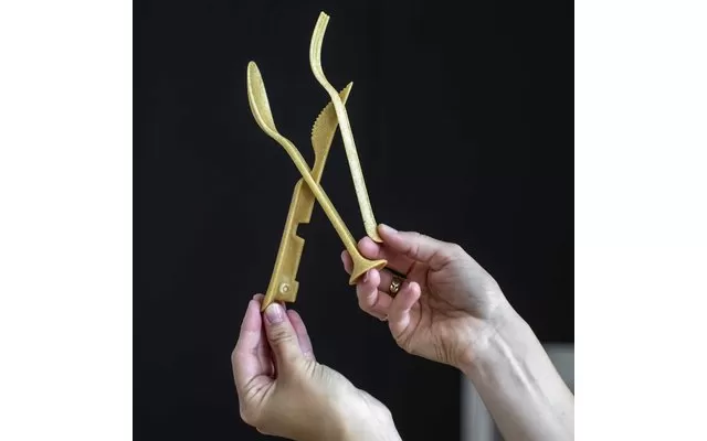 To open, simply press the button and all parts detach from each other very easily. The cutlery pieces fit comfortably in the hand and are extremely robust. The knife even takes on steaks. The material is particularly durable, tasteless, food safe and dishwasher safe.