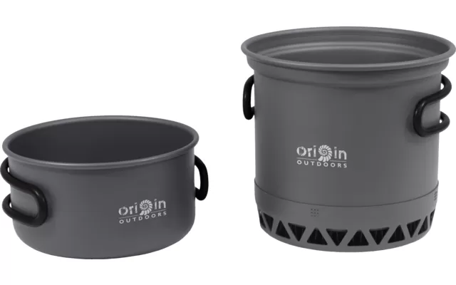 The very light pot set made of hard anodized aluminum is equipped with a highly efficient heat exchanger. The heat exchanger saves time when cooking and reduces fuel consumption. The sturdy folding handles provide a secure grip while cooking. Space-saving stowable, the transport takes place in the practical mesh bag.