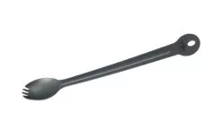 Extra long and lightweight universal cutlery with fork, spoon and practical fastening eye. The spork made of stainless titanium, impresses with its rounded edges and ergonomic shape. Ideally suited for high thermal containers or travel food from the bag. Thanks to its multifunctionality, you save extra weight. The spork is the perfect companion for traveling, hiking and trekking. Easy to clean and dishwasher safe.