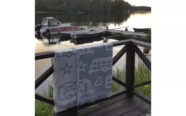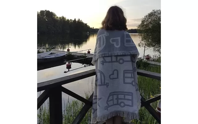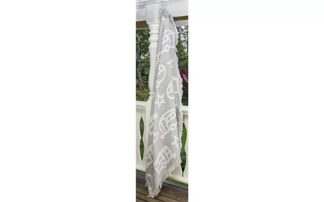 Pufz blanket with jacquard weave pattern of caravan in stylish neutral colors gray and white