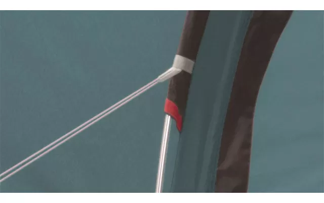 Locking spikes and double eyelets in sturdy webbing secure the interior poles to the ridge pole.