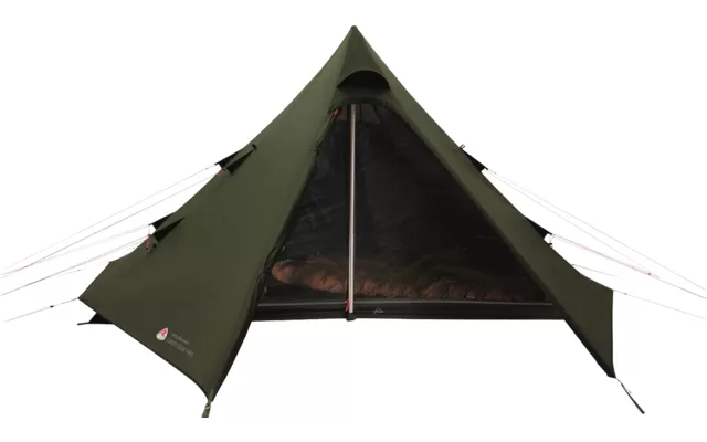 The versatile Green Cone PRS polyester tipi impresses with generous headroom, a large vestibule and room for four people inside. The offset center pole allows easy access and lifts the outer tent a little off the ground, creating a gap that provides better airflow. To save weight, the inner tent can be removed and the telescoping center pole adjusted so the outer tent sits directly on the ground – the perfect bivy tent. Small corner poles are sewn into the dark inner tent, creating a wall that provides additional usable space.