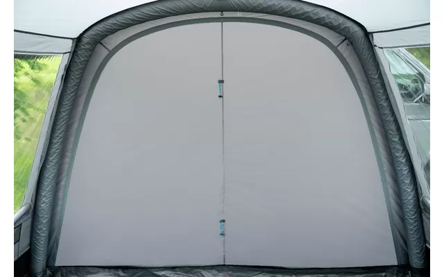 The air awning Hydra 2022 for bus or van offers an optimal use of space due to its modified front air tube shape. Thus, we achieve a full use of the floor space and an optimal standing height in the entire roof area. A removable airlock offers easy assembly and disassembly. Another advantage is that a small weight has to be pulled into the awning.