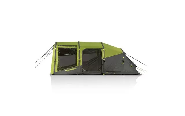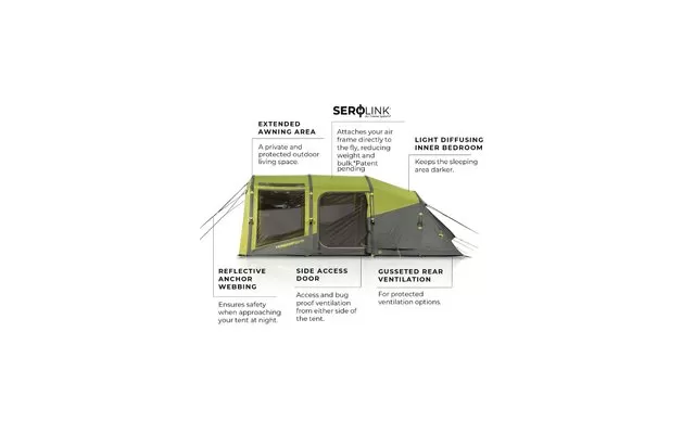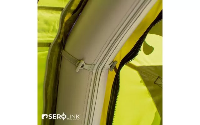 A light-reflecting material inside the sleeping cabin provides undisturbed sleep. Angled beam construction provides both improved wind stability and comfortable headroom throughout the tent.